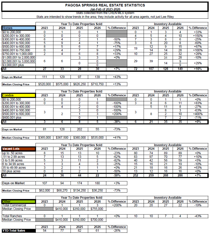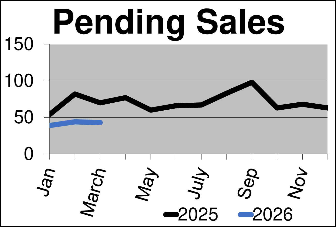 Sales in the month of February were way down, with 28 completed sales in February 2026 compared to 52 sales in 2025. Pending sales are also soft, with 43 this year versus 70 last year.